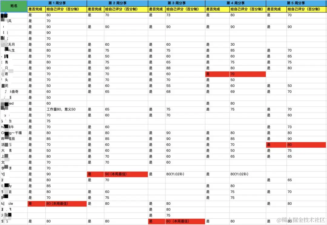 我们来看一张表,记录了大家这几周的学习打卡情况。红色表示该周「乐学奖学金」得主。