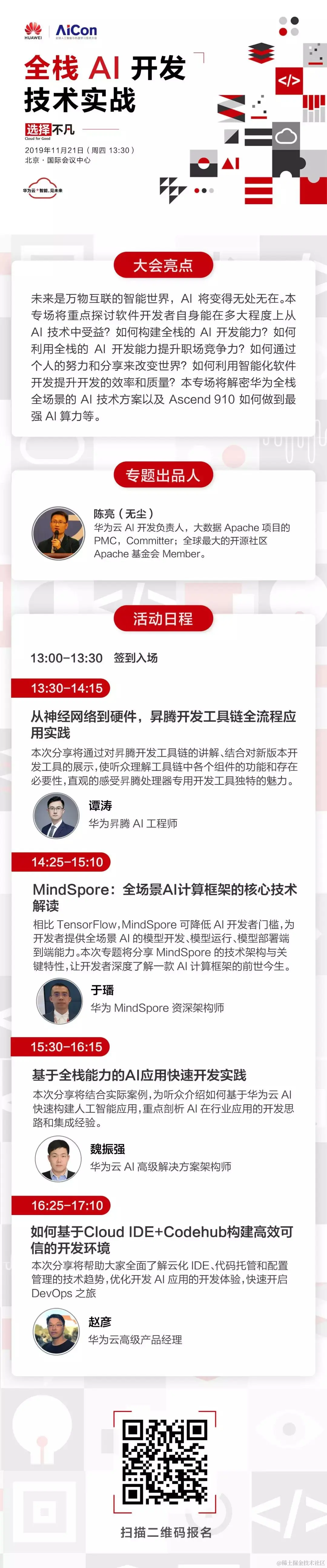 作为智能化时代最重要的角色之一,因此在2019年11月21日,AICon2019全球人工智能与机器学习技术大会【全栈AI开发技术实战专场】上,华为云将会分别从底层AI开发环境搭建、完全自研的AI计算框架的设计理念、全场景AI应用开发实战等多角度入手,为开发者详解AI趋势下应用开发的全实践。