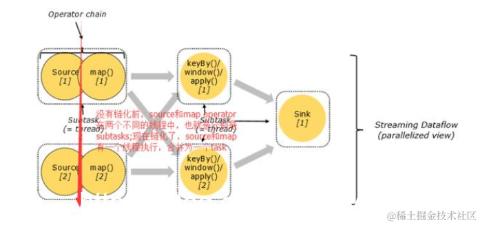 对于分布式计算,Flink封装operator subtasks 链化为tasks;每个task由一个线程执行;把tasks链化有助于优化,它减少了开销线程和线程之间的交接和缓冲;增加了吞吐量和减少延迟时间;链化的作用可以见下图:在没有链化之前,source operator和map operator 是两个线程运行的两个task,也就是说下面的dataflow 最初应该有7个subtasks;