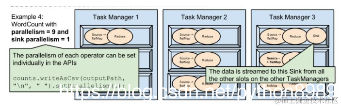 当然也可以把某个operator的并行度另外设置,比如把sink的并行度设置为1,那多task分配就会如下图: