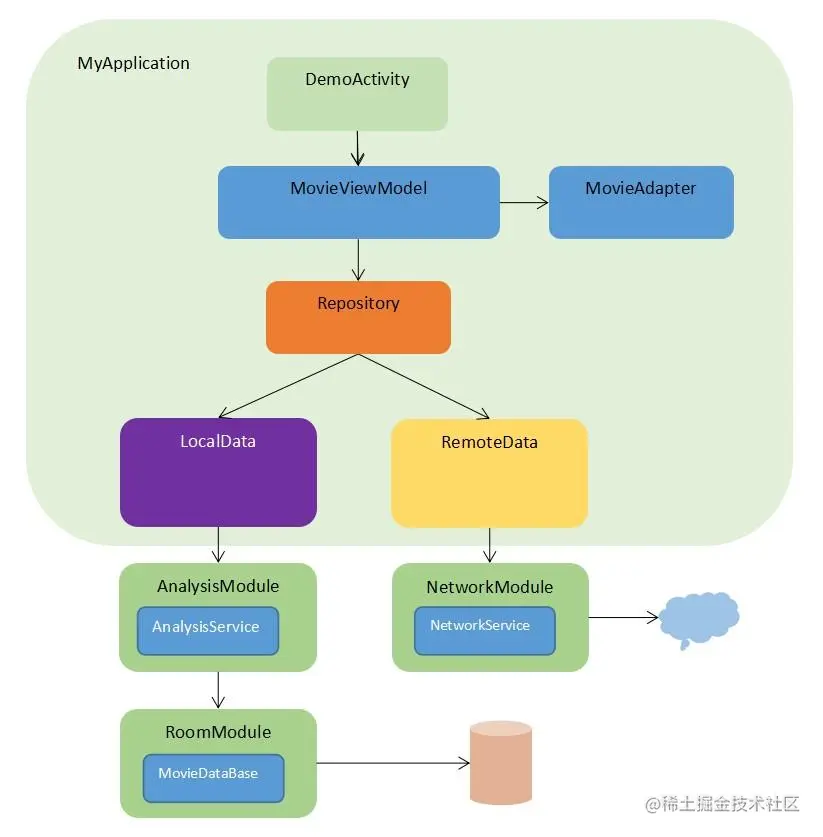 NetworkModule提供单例的Retrofit接口,向OMDB发出搜索电影的请求 - LocalData依赖