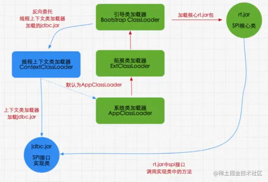 接口由引导类加载器加载,具体接口的实现类,由系统类加载器加载