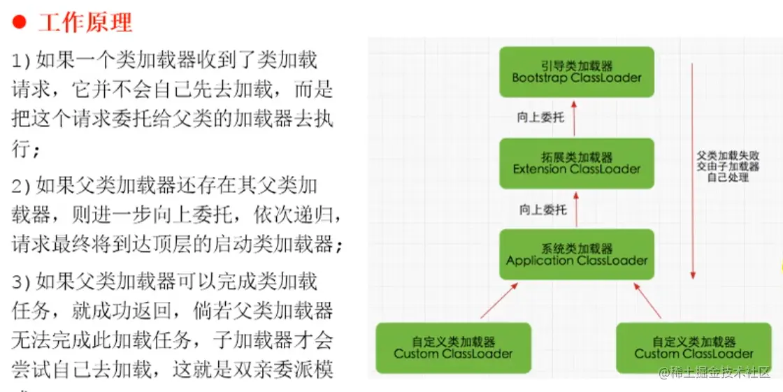 当一个类加载器收到了类加载请求,如果存在父类加载器,就需要将请求委托给父类,如果父类可以完成,就由父类完成,请求完成以后不再下派。如果不能,则请求下派,直至最后自己加载。