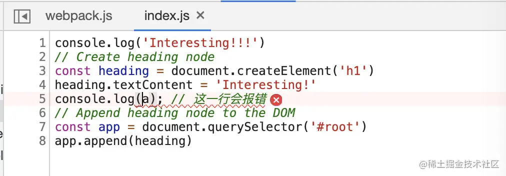 "console.log('Interesting!!!')\n// Create heading node\nconst heading = document.createElement('h1')\nheading.textContent = 'Interesting!'\nconsole.log(a); // 这一行会报错\n// Append heading node to the DOM\nconst app = document.querySelector('#root')\napp.append(heading)"