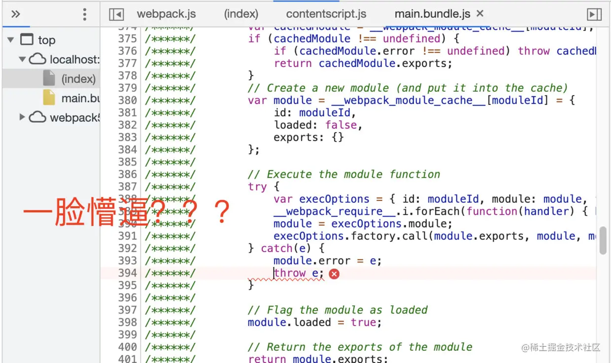 打包出来的 main.bundle.js ,可以看到最后一行是 //# sourceMappingURL=main.bundle.js.map,就是告诉浏览器源码所在的位置 是 main.bundle.js.map
