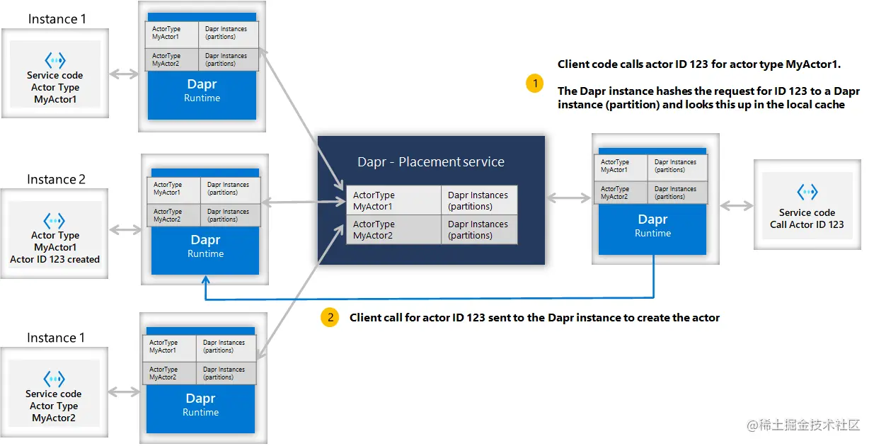 Actor placement service 为系统提供了 actor 分发和管理,placement 会跟踪 actor 类型和所有实例的分区,并将这些分区信息同步到每个 dapr 实例中,并跟踪他们的创建和销毁。