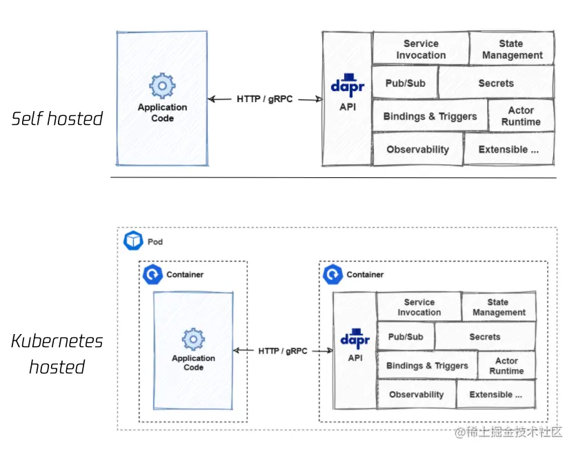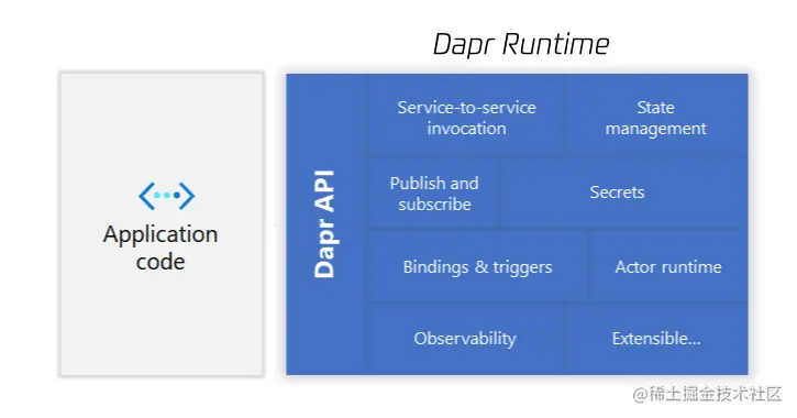 长期以来,这些功能的适配都是集成在业务代码里的。dapr 创新之处是将这些功能,从原来 application runtime 中拆分出来,作为一个独立的 runtime。dapr runtime 也满足上面说到的 runtime 的特征。