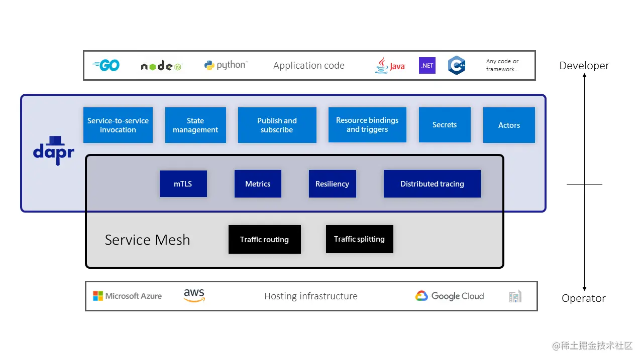 Dapr 旨在提供应用所需要的分布式能力,这些能力是和业务的正常运作息息相关的, dapr 提供的能力不是透明的,是需要应用显示的调用,所以 dapr 主要面向的开发人员。