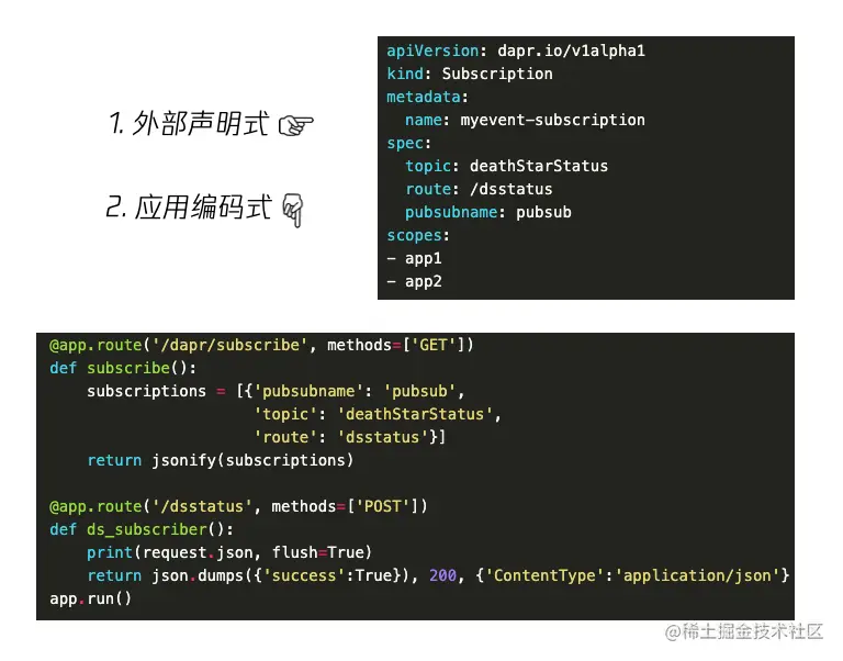 二者提供的功能是一致的。外部声明方式需要多维护一个 CRD 对象,适合订阅者或订阅主题经常发生变化的场景,这样在调整时不需要改应用代码。应用编码方式刚好相反,订阅配置写死在代码里,适合订阅主题不需要动态调整的场景。