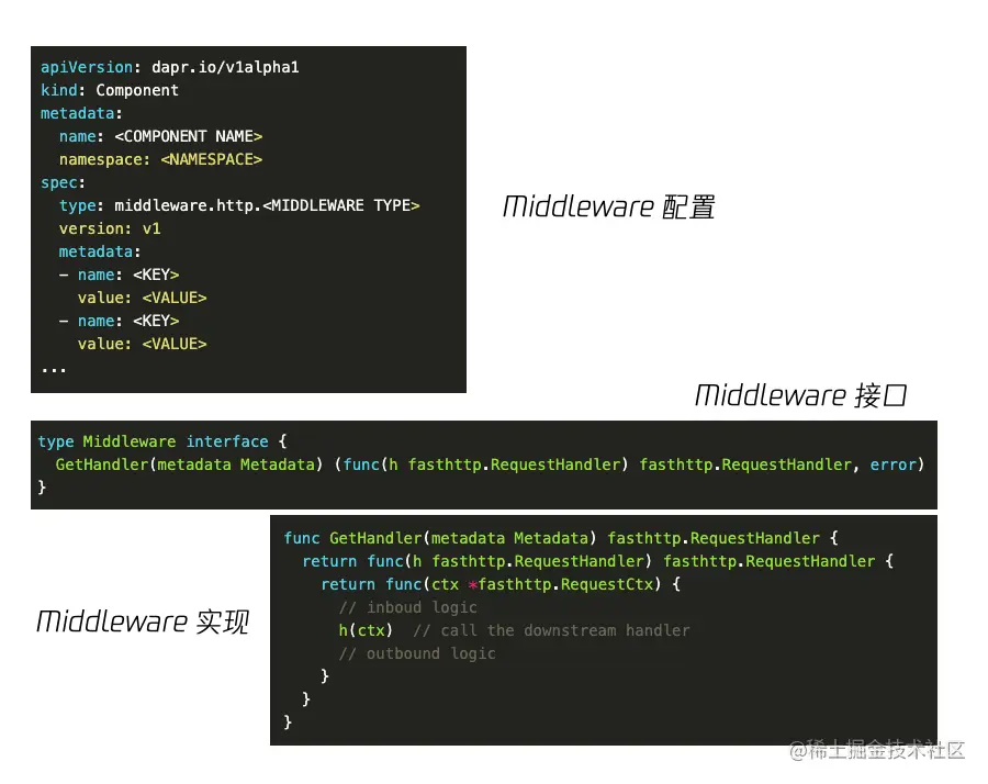 咋一看这可能是一个不太起眼的功能,但和传统 web 框架的middleware不一样, dapr runtime 本身是在应用进程之外,所以不存在语言限制的问题。这使得 middleware 提供的功能可以跨语言共享。比如 dapr 原生没有提供限流和自定义鉴权的功能(呼声很高的2个场景),我们可以遵循 middleware 的接口按需实现,然后植入 dapr 运行时中。