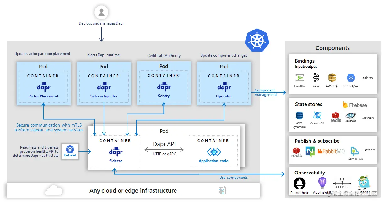 Sentry: 为 dapr 系统中的工作负载提供基于 mtls 的安全通信。mtls 能强制通信双方进行身份认证,同时在认证之后保证通信都走加密通道。Sentry 的功能很类似 istio 里的 Citadel (目前已经合并到 istiod)。在整个过程中,sentry 充当证书颁发机构(CA),处理 dapr sidecar 发起的签署证书请求,另外还要负责证书的轮转。除了 dapr sidecar 之间的自动 mTLS 之外,sidecar 和 dapr 控制面服务之间也是强制性的 mTLS。
