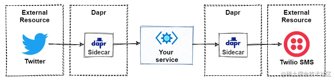Bindings 其实和之前的 pub/sub 非常类似,也是利用异步通信传递消息。它俩主要的区别是:pub/sub 主要面向的是 dapr 内部应用,而 bindings 主要解决的和外部依赖系统的输入输出。