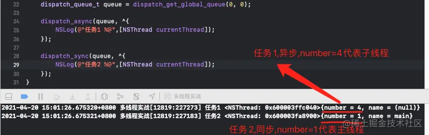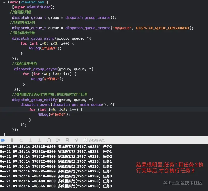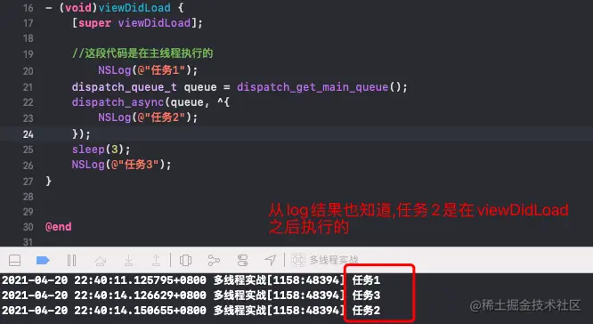 这里任务3也可以精简写,直接把queue改成main_queue就可以;还有个就是我们还可以添加任务4,也是和任务3一样的写法,那么任务3和任务4就会等任务1和任务2执行完以后,交替执行!