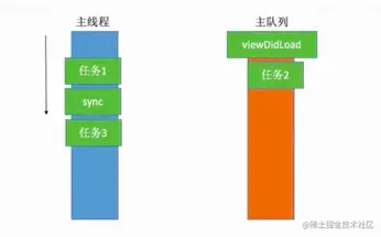 所以看图就很清晰,想取出任务2必须viewDidLoad执行完毕,viewDidLoad执行完毕必须任务3执行完毕,而任务3执行完毕,必须要执行完sync,而sync又取不出来任务2,所以造成死锁.我们也可以证明任务2只要是主队列中,它肯定是在viewDidLoad后面执行.我们只要把上面的同步改成异步即可,请看下图: