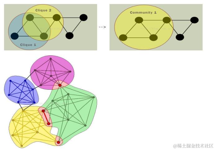 该算法通过寻找完全子图(任意2个节点之间都存在边关系),节点数为k的完全子图,称为k-clique。