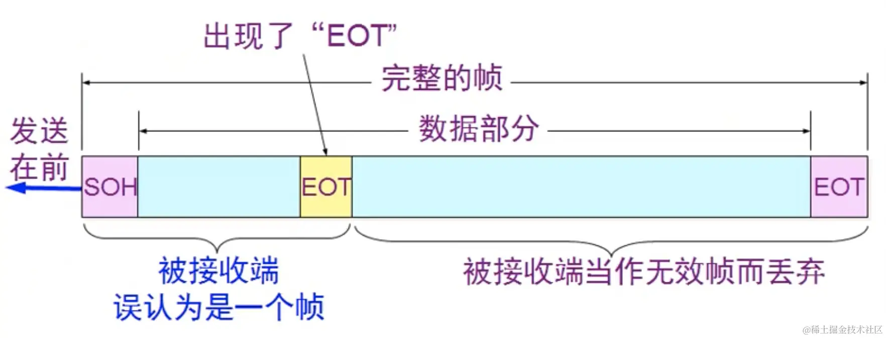 在接收端接收数据帧的过程中,如果数据帧的数据部分包含了帧结束符,那么就会导致接收端误认为这是一个完整的帧,然后把剩余的部分当做无效帧抛弃掉,为了解决这个问题,引入了字节填充法。