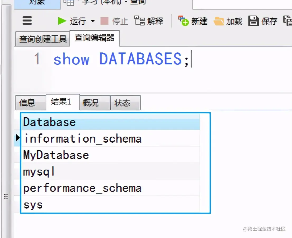 再通过show DATABASES;命令查看当前有哪些数据库,可以发现确实多了刚才新建文件夹(数据库)。