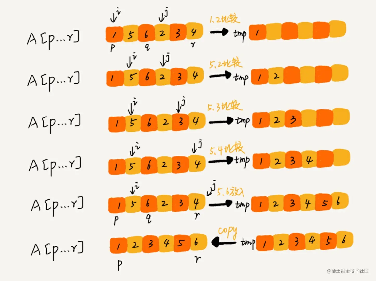 - 比较两个指针所指向的元素,选择相对小的元素放入到合并空间,并移动指针到下一位置