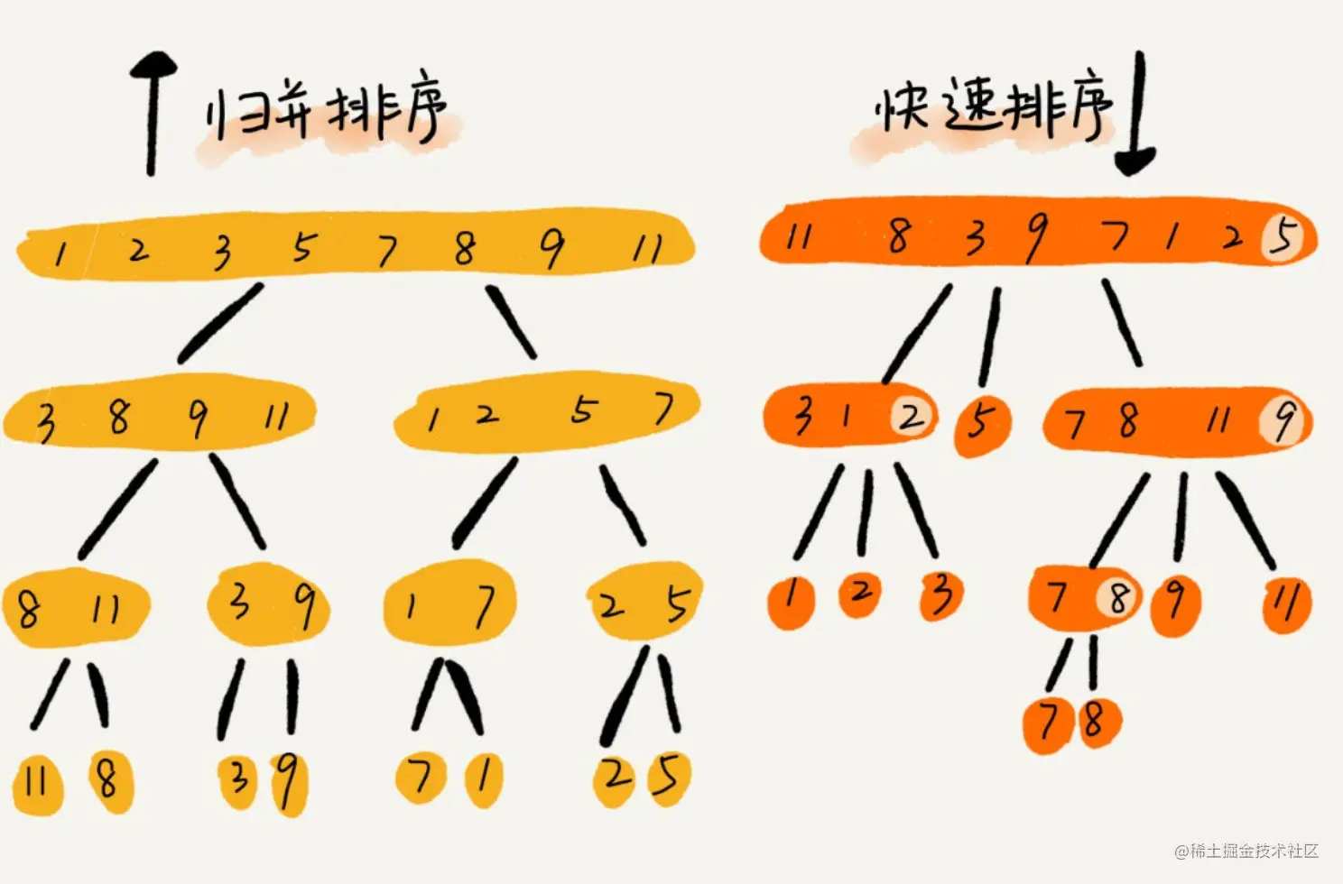 - 归并排序的处理过程是由下到上的,先处理子问题,然后再合并。而快排正好相反,它的处理过程是由上到下的,先分区,然后再处理子问题。