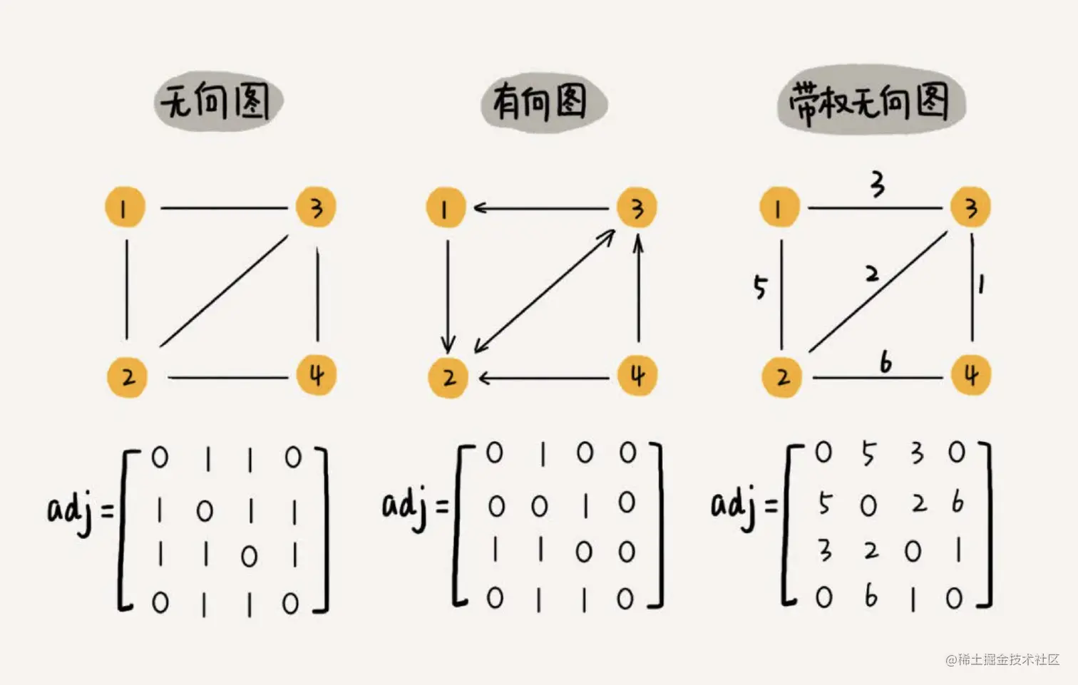 对于无向图来说,如果顶点 i 与顶点 j 之间有边,我们就将 A[i][j] 和 A[j][i] 标记为1;对于有向图来说,如果顶点 i 到顶点 j 之间,有一条箭头从顶点 i 指向顶点 j 的边,那我们就将 A[i][j] 标记为1。同理,如果有一条箭头从顶点 j 指向顶点 i 的边,我们就将 A[j][i] 标记为1。对于带权图,数组中就存储相应的权重。
