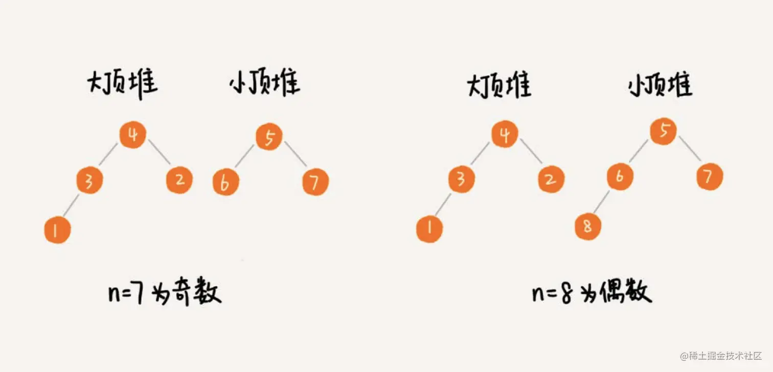也就是说,如果有n个数据,n是偶数,我们从小到大排序,那前 个数据存储在大顶堆中,后 个数据存储在小顶堆中。这样,大顶堆中的堆顶元素就是我们要找的中位数。如果n是奇数,情况是类似的,大顶堆就存储 个数据,小顶堆中就存储 个数据。
