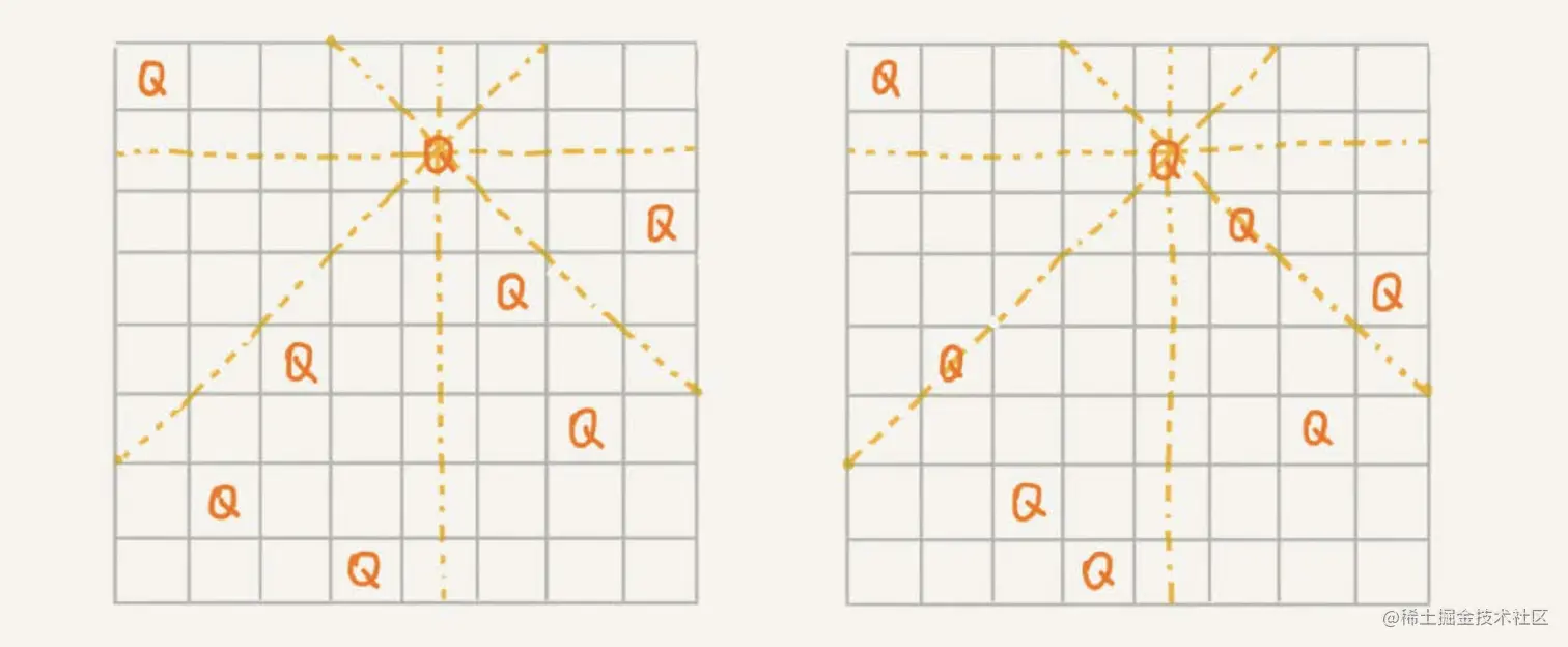 2. 对角:检查数组在下标为cur_column之前的元素,其行的间距pos - QUEEN_LIST[i]