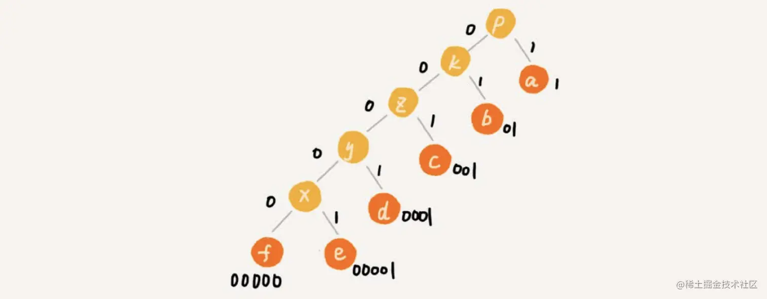 假设这6个字符出现的频率从高到低依次是a、b、c、d、e、f。我们把它们编码下面这个样子,任何一个字符的编码都不是另一个的前缀,在解压缩的时候,我们每次会读取尽可能长的可解压的二进制串,所以在解压缩的时候也不会歧义。经过这种编码压缩之后,这1000个字符只需要2100bits就可以了。