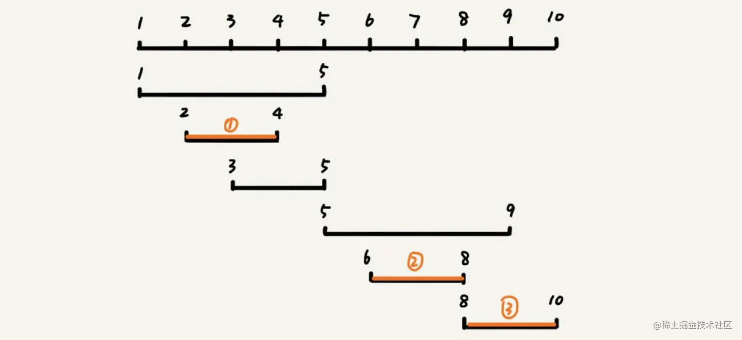 我们按照起始端点从小到大的顺序对这n个区间排序。我们每次选择的时候,左端点跟前面的已经覆盖的区间不重合的,右端点又尽量小的,这样可以让剩下的未覆盖区间尽可能的大,就可以放置更多的区间。这实际上就是一种贪心的选择方法。