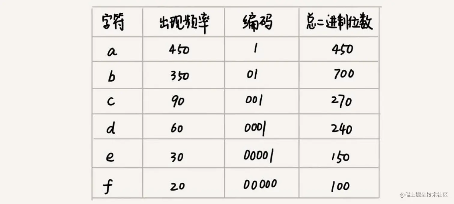 假设我们通过统计分析发现,这1000个字符中只包含6种不同字符,假设它们分别是a、b、c、d、e、f。而3个二进制位(bit)就可以表示8个不同的字符,所以,为了尽量减少存储空间,每个字符我们用3个二进制位来表示。那存储这1000个字符只需要3000bits就可以了,比原来的存储方式节省了很多空间。不过,还有没有更加节省空间的存储方式呢?