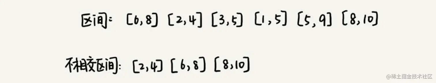 假设我们有n个区间,区间的起始端点和结束端点分别是[l1, r1],[l2, r2],[l3, r3],......,[ln, rn]。我们从这n个区间中选出一部分区间,这部分区间满足两两不相交(端点相交的情况不算相交),最多能选出多少个区间呢?