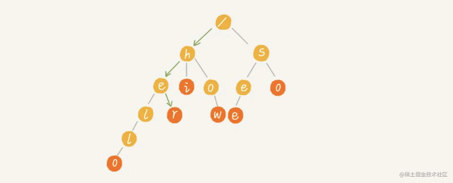但是,Trie树的优势并不在于,用它来做动态集合数据的查找,因为,这个工作完全可以用更加合适的散列表或者红黑树来替代。Trie树最有优势的是查找前缀匹配的字符串,比如搜索引擎中的关键词提示功能这个场景,就比较适合用它来解决,也是Trie树比较经典的应用场景。