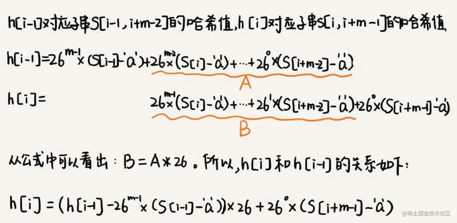 整个RK算法包含两部分,计算子串哈希值和模式串哈希值与子串哈希值之间的比较。
