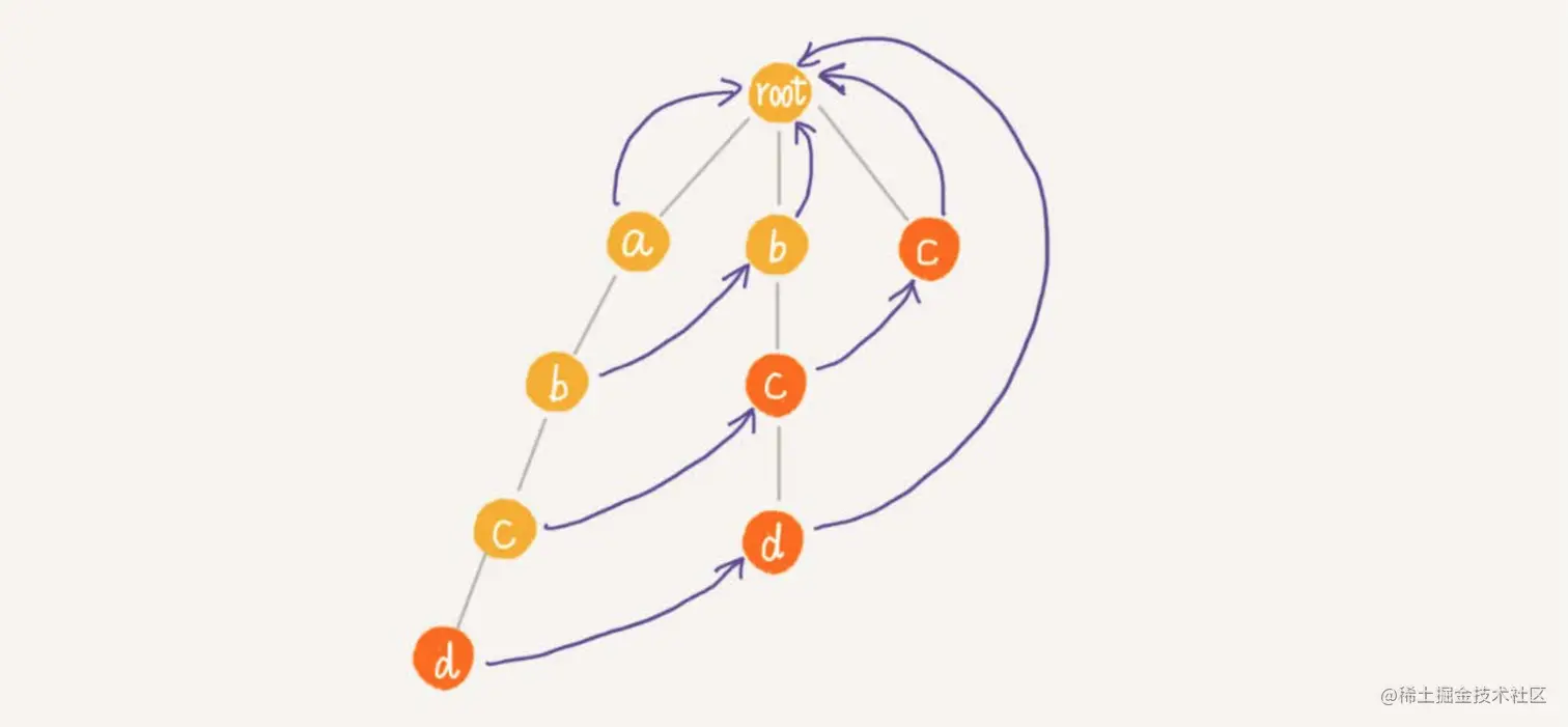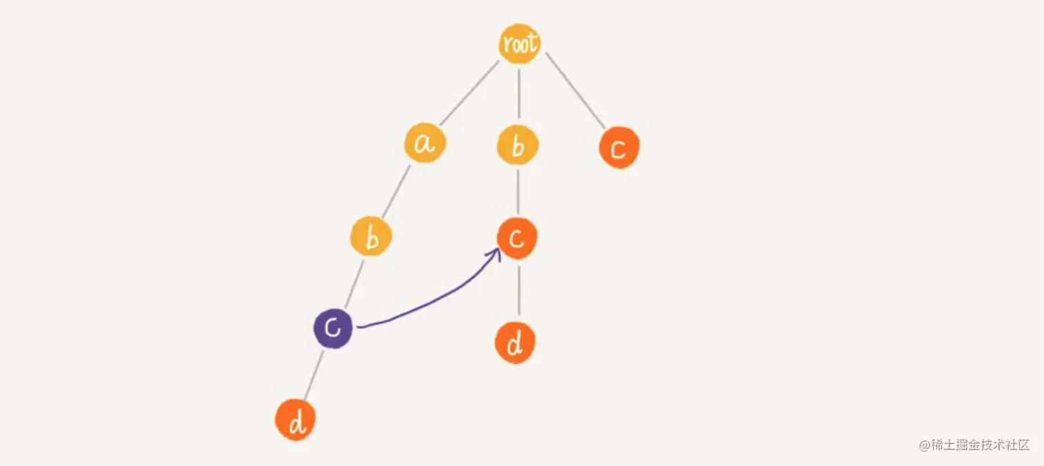 你可能会说,从时间复杂度上看,AC自动机匹配的效率跟Trie树一样啊。实际上,因为失效指针可能大部分情况下都指向root节点,所以绝大部分情况下,在AC自动机上做匹配的效率要远高于刚刚计算出的比较宽泛的时间复杂度。只有在极端情况下,如图所示,AC自动机的性能才会退化的跟Trie树一样。