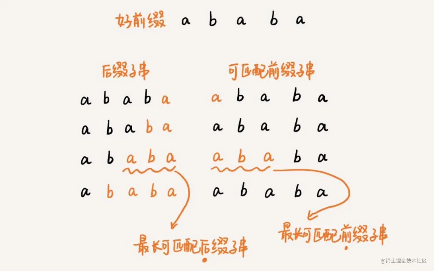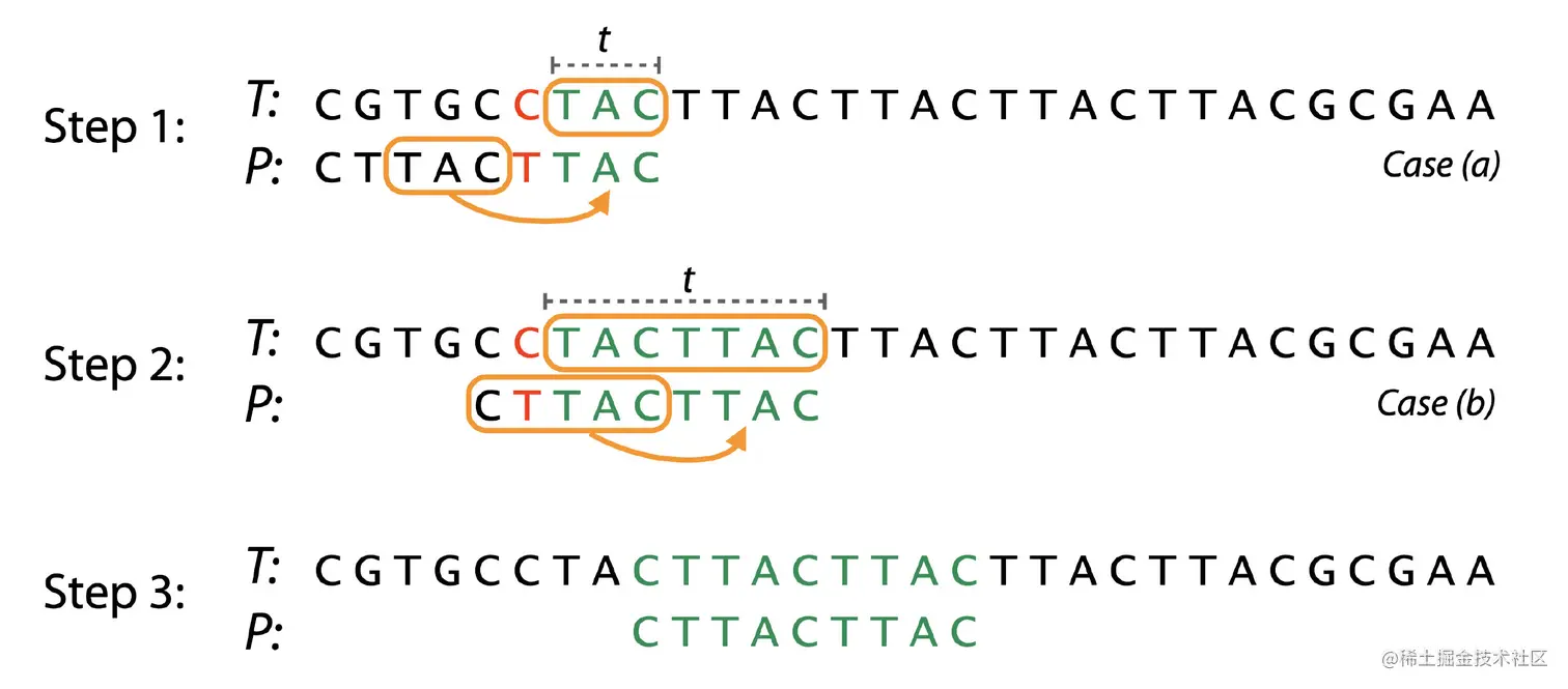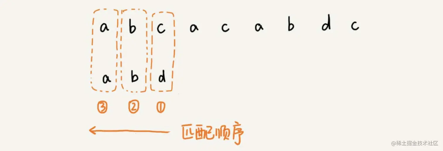 - 如果没有找到可匹配的子串,我们需要检查好后缀的后缀子串,是否存在跟模式串的前缀子串相匹配的情况