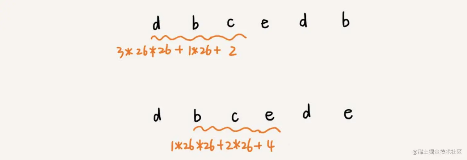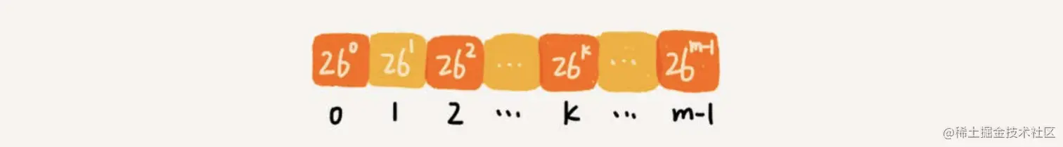 不过,这里有一个小细节需要注意,那就是26^(m-1)这部分的计算,我们可以通过查表的方法来提高效率。我们事先计算好26^0、26^1、26^2......26^(m-1),并且存储在一个长度为m的数组中,公式中的“次方”就对应数组的下标。当我们需要计算26的x次方的时候,就可以从数组的下标为x的位置取值,直接使用,省去了计算的时间。