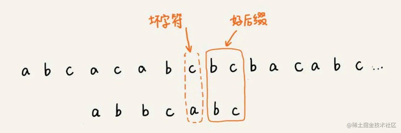 我们把已经匹配的 bc 叫作好后缀,记作 {u} 。我们拿它在模式串中查找,可能出现两种情况: