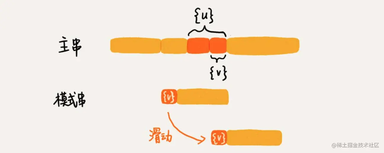 - 如果找到了另一个跟 {u} 相匹配的子串 {},那我们就将模式串滑动到子串 {} 与主串中 {u} 对齐的位置