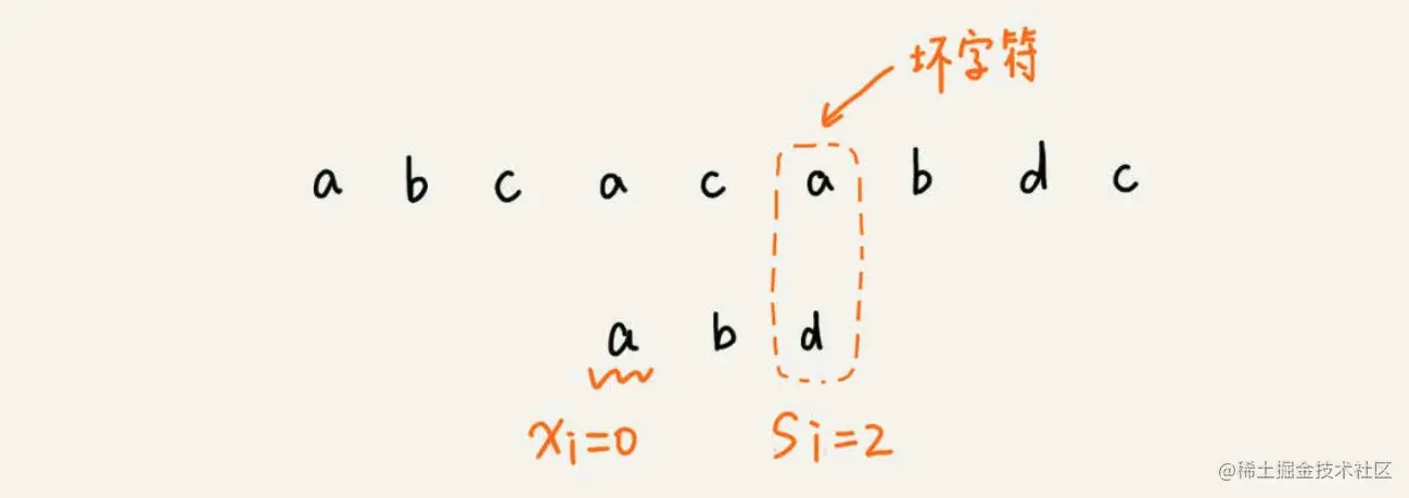 当发生不匹配的时候,我们把坏字符对应的模式串中的下标记作 si。如果坏字符在模式串中存在,我们把这个坏字符在模式串中的下标记作 xi。如果不存在,我们把 xi 记作 -1。那模式串往后移动的位数就等于si-xi。(注意,我这里说的下标,都是字符在模式串的下标)。