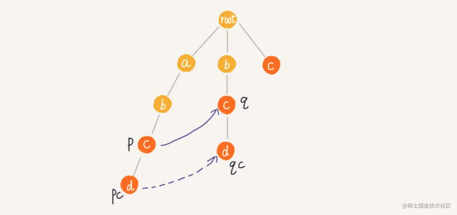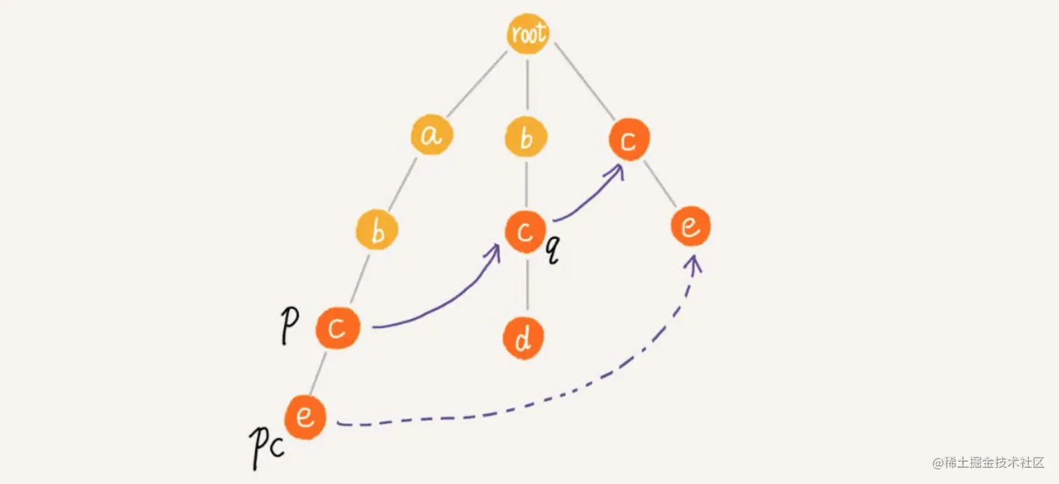 我们假设节点p的失败指针指向节点q,我们看节点p的子节点pc对应的字符,是否也可以在节点q的子节点中找到。如果找到了节点q的一个子节点qc,对应的字符跟节点pc对应的字符相同,则将节点pc的失败指针指向节点qc。