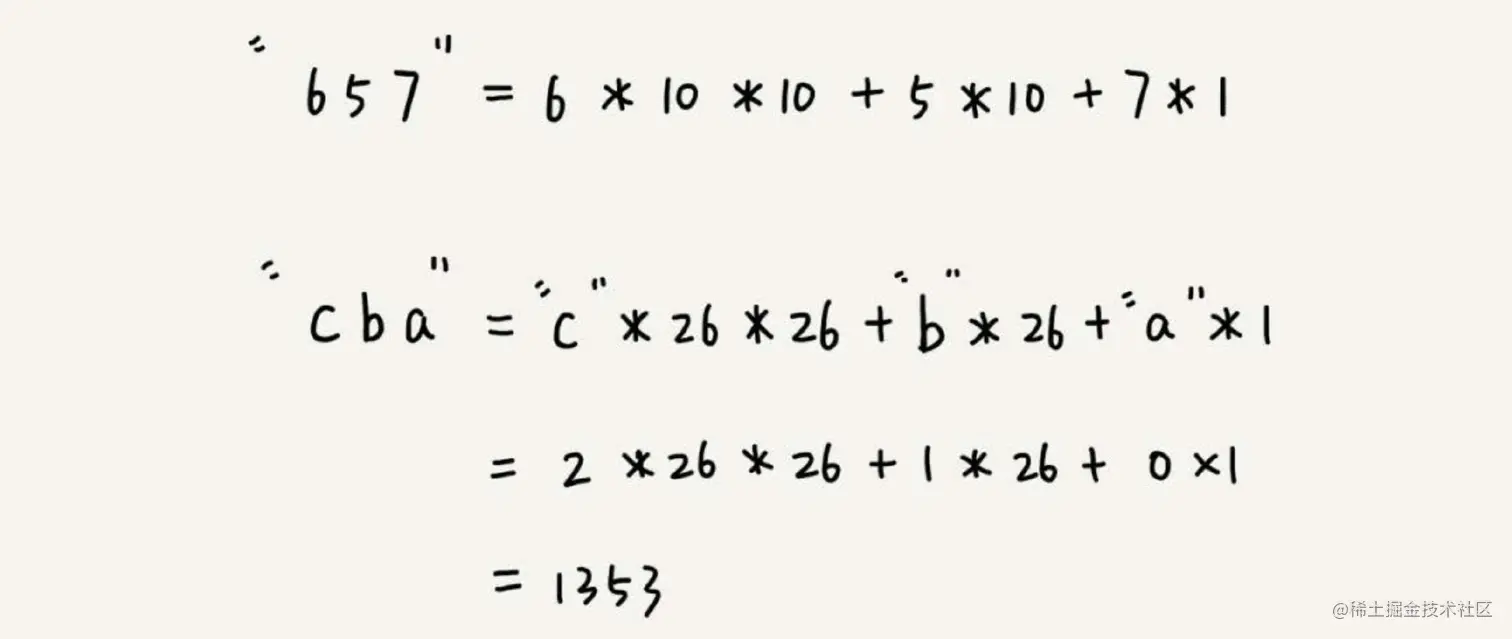 在十进制的表示法中,一个数字的值是通过下面的方式计算出来的。对应到二十六进制,一个包含a到z这26个字符的字符串,计算哈希的时候,我们只需要把进位从10改成26就可以。