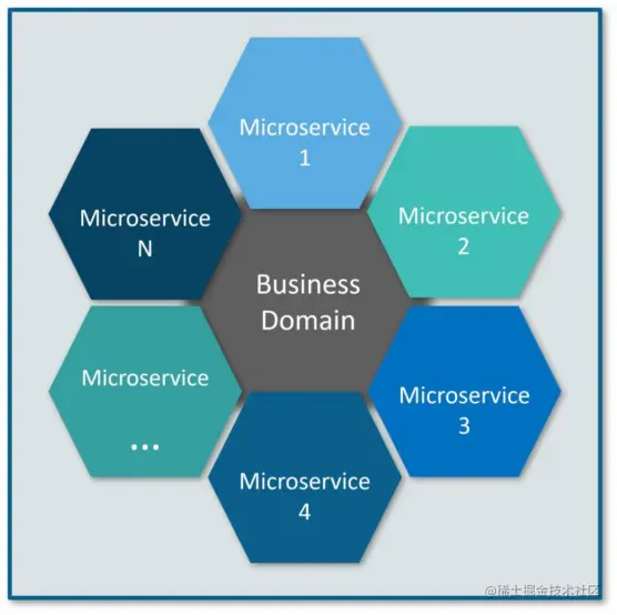 这里,每个六边形形状代表单独的服务组件。与蜜蜂的工作类似,每个敏捷团队都使用可用的框架和所选的技术堆栈构建单独的服务组件。