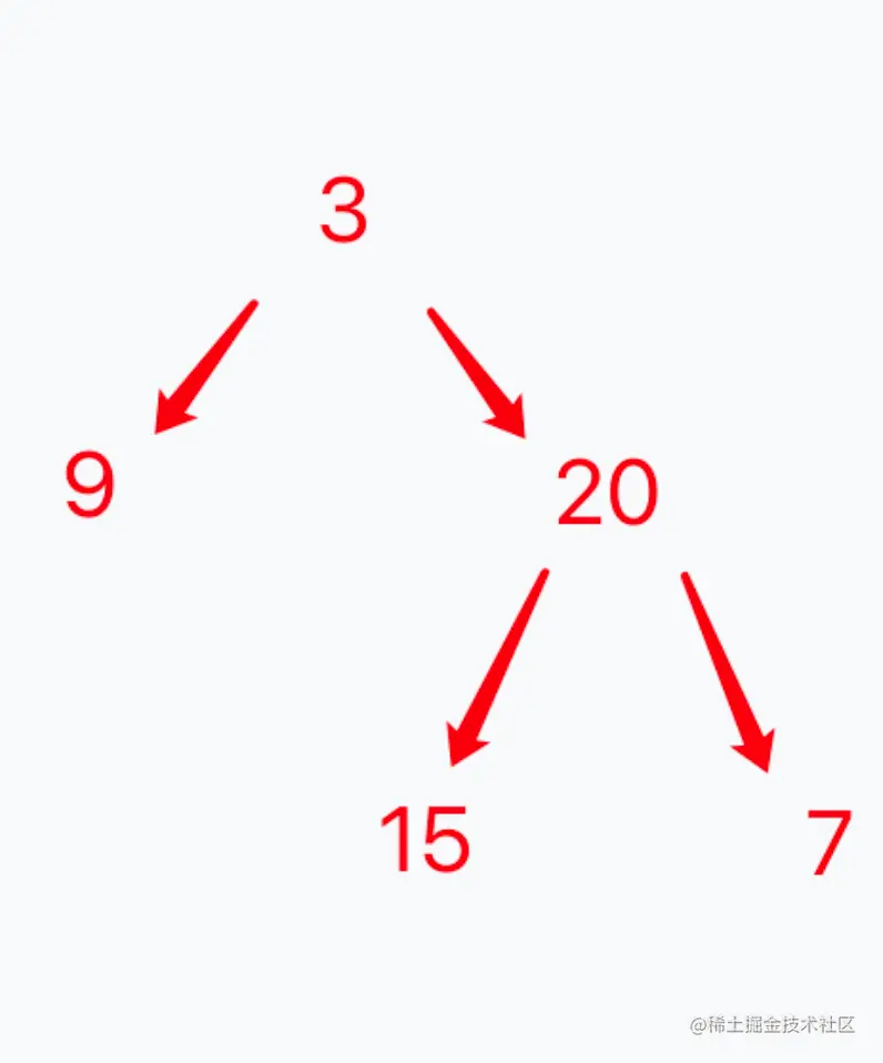 所以在这个栗子中,preorder中第一个数就是根节点,也就是3。inorder中3的左子树集合是[9],右子树集合是[15,20,7],左子树就一个节点,不做分析。结合preorder我们可以得知右子树的前序遍历是[20,15,7],那么右子树的根节点就是20,结合inorder中右子树的中序遍历可得右子树的左子树集合是[15],右子树的右子树集合是[7],都是一个节点,至此分析完毕,我们也通过前序和中序遍历还原了一个二叉树,如图: