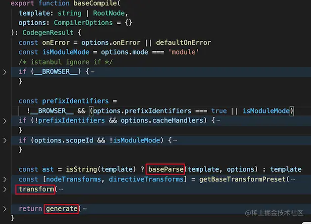 可以看到,baseCompile也遵循parse、transtrom、 codegen的过程。