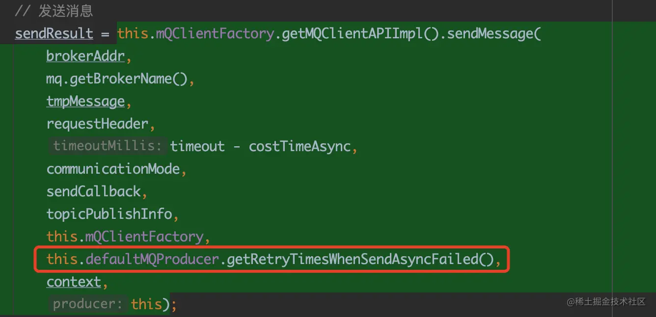 在这个方法里,也会对消息进行重试操作,这个重试次数是在DefaultMQProducerImpl#sendKernelImpl中传入的: