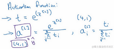 回忆一下我们之前举的的例子,输出层计算出的 如下, 我们有四个分类 , 可以是4×1维向量,我们计算了临时变量 , ,对元素进行幂运算,最后,如果你的输出层的激活函数 是Softmax激活函数,那么输出就会是这样的: