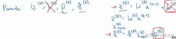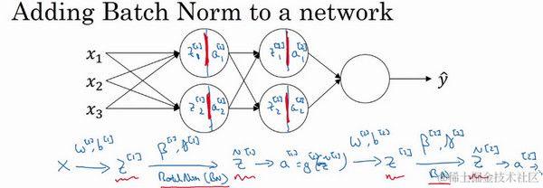 所以需要强调的是Batch归一化是发生在计算 和 之间的。直觉就是,与其应用没有归一化的 值,不如用归一过的 ,这是第一层( )。第二层同理,与其应用没有规范过的 值,不如用经过方差和均值归一后的 。所以,你网络的参数就会是 , , 和 等等,我们将要去掉这些参数。但现在,想象参数 , 到 , ,我们将另一些参数加入到此新网络中 , , , 等等。对于应用Batch归一化的每一层而言。需要澄清的是,请注意,这里的这些 ( , 等等)和超参数 没有任何关系,下一张幻灯片中会解释原因,后者是用于Momentum或计算各个指数的加权平均值。Adam论文的作者,在论文里用 代表超参数。Batch归一化论文的作者,则使用 代表此参数( , 等等),但这是两个完全不同的 。我在两种情况下都决定使用 ,以便你阅读那些原创的论文,但Batch归一化学习参数 , 等等和用于Momentum、Adam、RMSprop算法中的 不同。