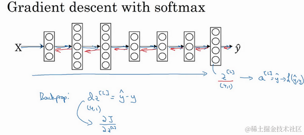 最后我们来看一下,在有Softmax输出层时如何实现梯度下降法,这个输出层会计算 ,它是 维的,在这个例子中是4×1,然后你用Softmax激活函数来得到 或者说 ,然后又能由此计算出损失。我们已经讲了如何实现神经网络前向传播的步骤,来得到这些输出,并计算损失,那么反向传播步骤或者梯度下降法又如何呢?其实初始化反向传播所需要的关键步骤或者说关键方程是这个表达式 ,你可以用 这个4×1向量减去 这个4×1向量,你可以看到这些都会是4×1向量,当你有4个分类时,在一般情况下就是 ,这符合我们对 的一般定义,这是对 损失函数的偏导数( ),如果你精通微积分就可以自己推导,或者说如果你精通微积分,可以试着自己推导,但如果你需要从零开始使用这个公式,它也一样有用。