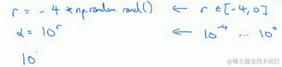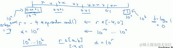 更常见的情况是,如果你在 和 之间取值,在此例中,这是 (0.0001),你可以通过 算出 的值,即-4,在右边的值是 ,你可以算出 的值 ,即0。你要做的就是在 区间随机均匀地给 取值,这个例子中 ,然后你可以设置 的值,基于随机取样的超参数 。