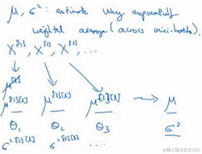 最后在测试时,对应这个等式( ),你只需要用你的 值来计算 ,用 和 的指数加权平均,用你手头的最新数值来做调整,然后你可以用左边我们刚算出来的 和你在神经网络训练过程中得到的 和 参数来计算你那个测试样本的 值。