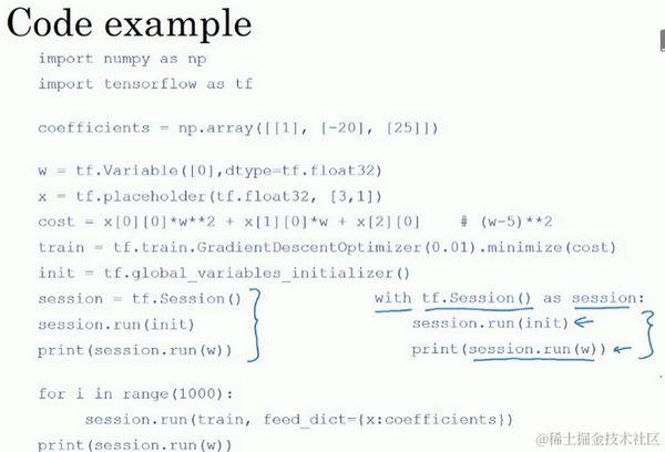 但这个with结构也会在很多TensorFlow程序中用到,它的意思基本上和左边的相同,但是Python中的with命令更方便清理,以防在执行这个内循环时出现错误或例外。所以你也会在编程练习中看到这种写法。那么这个代码到底做了什么呢?让我们看这个等式: